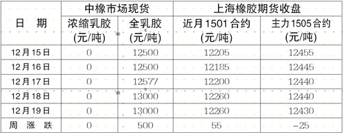 注:全乳膠即相當于原乳標一。上海橡膠期貨近月1501/5合約價格是指2015年1/5月15日上海交貨的價格;主力1411/1501合約是指當前上海橡膠期貨交易最活躍的合約,其價格是指2014年11/2015年1月15日的交貨價格。
